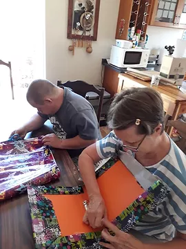 Iphepha for Pupils volunteer, Marlene and her son covering donated folders in new paper and plastic.