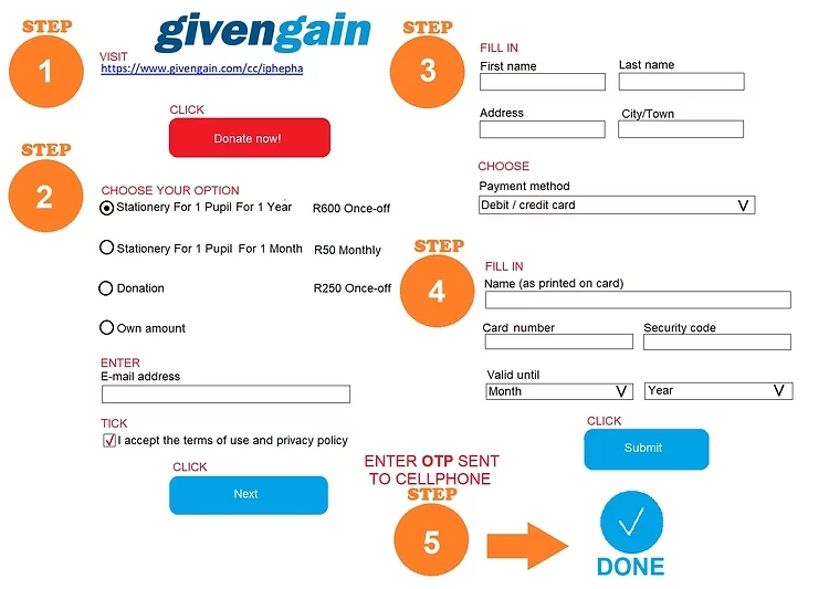 Click HERE to be redirected to GIVEGAIN & set up a fundraising profile and raise funds for Iphepha for Pupils.