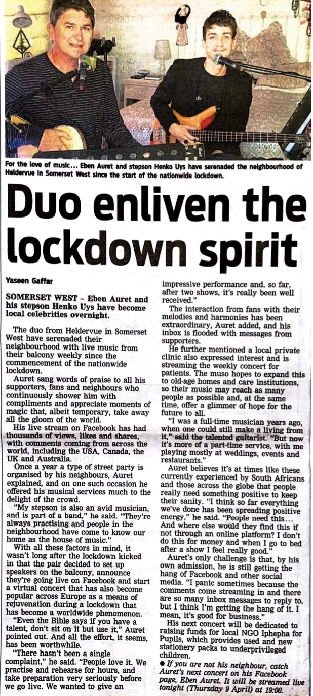 Iphepha for Pupils volunteers, Eben Auret and Henko Uys held an online concert in aid of Iphepha on 9 April 2020.